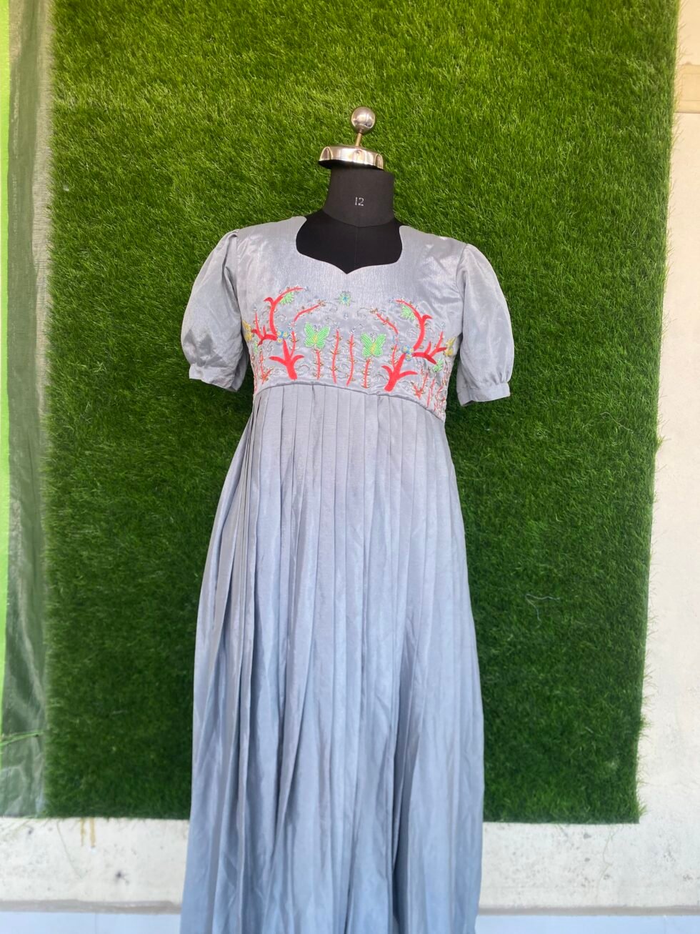 – Premium Quality Designer Grey Color Full Length frock with work in the yoke part