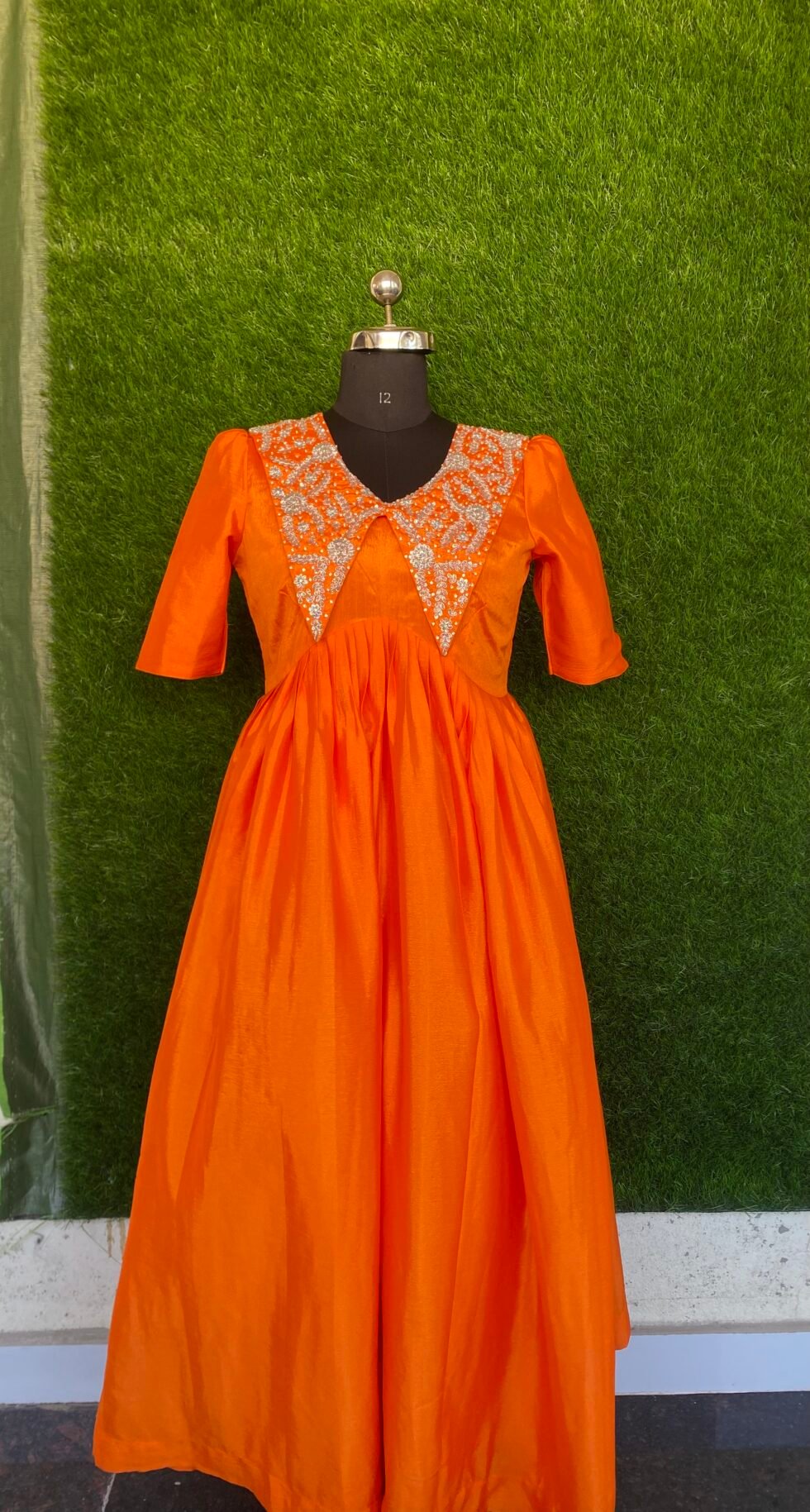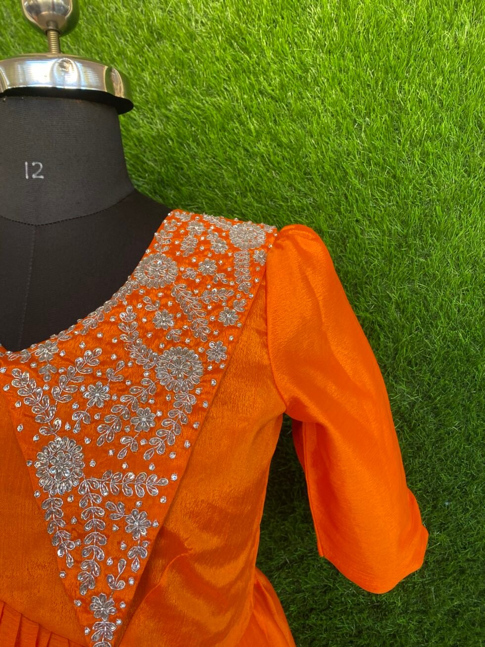 – Premium Quality Designer Orange Color Full Length frock with Maggam work in Bodice area