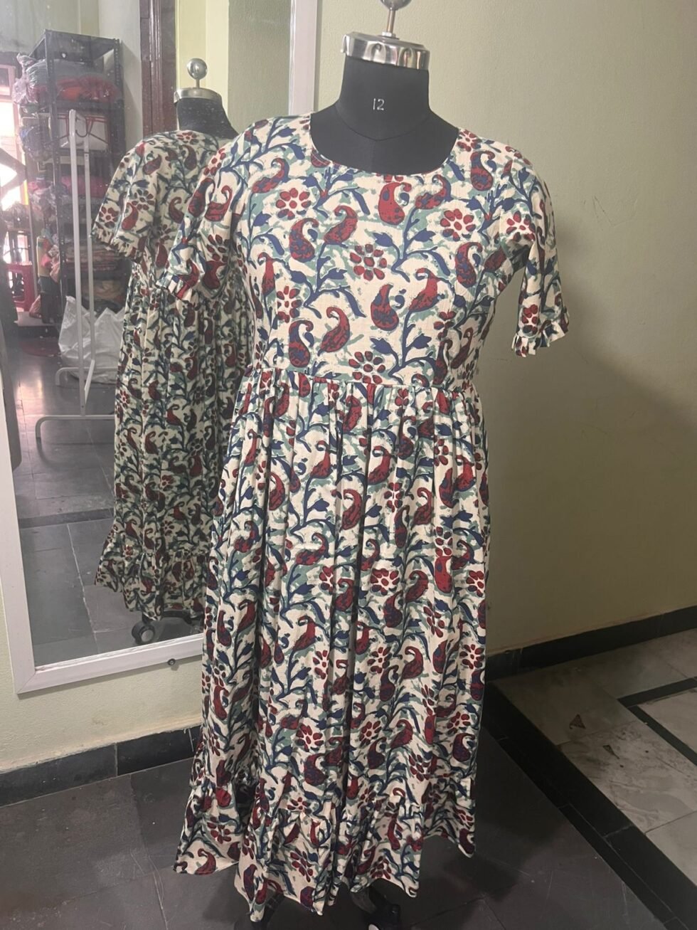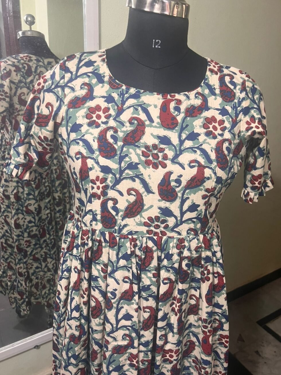 – Premium Quality Designer Cream Color with Blue Floral Knee Length frock