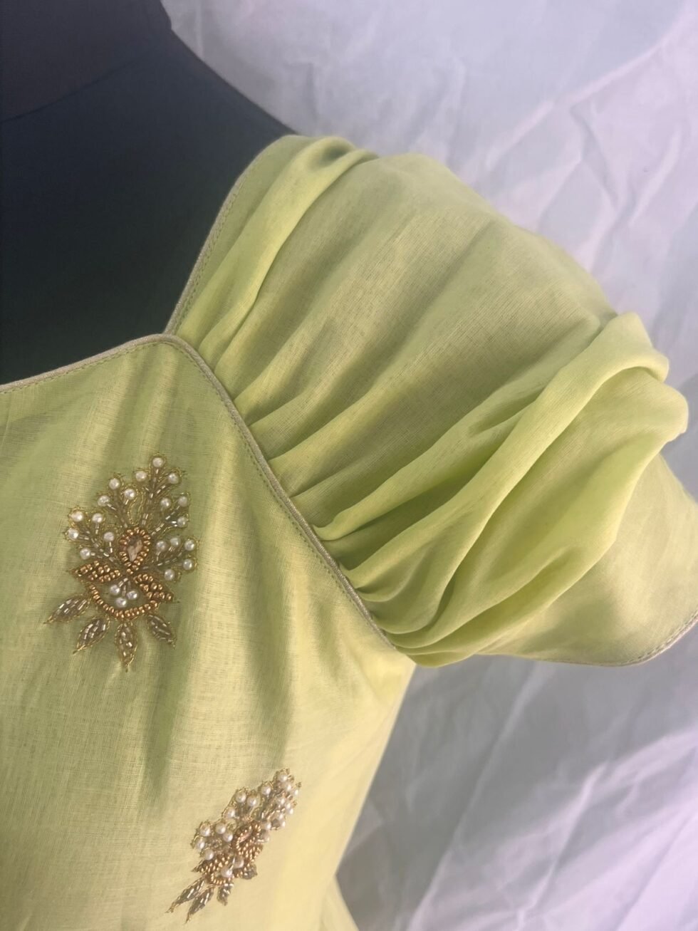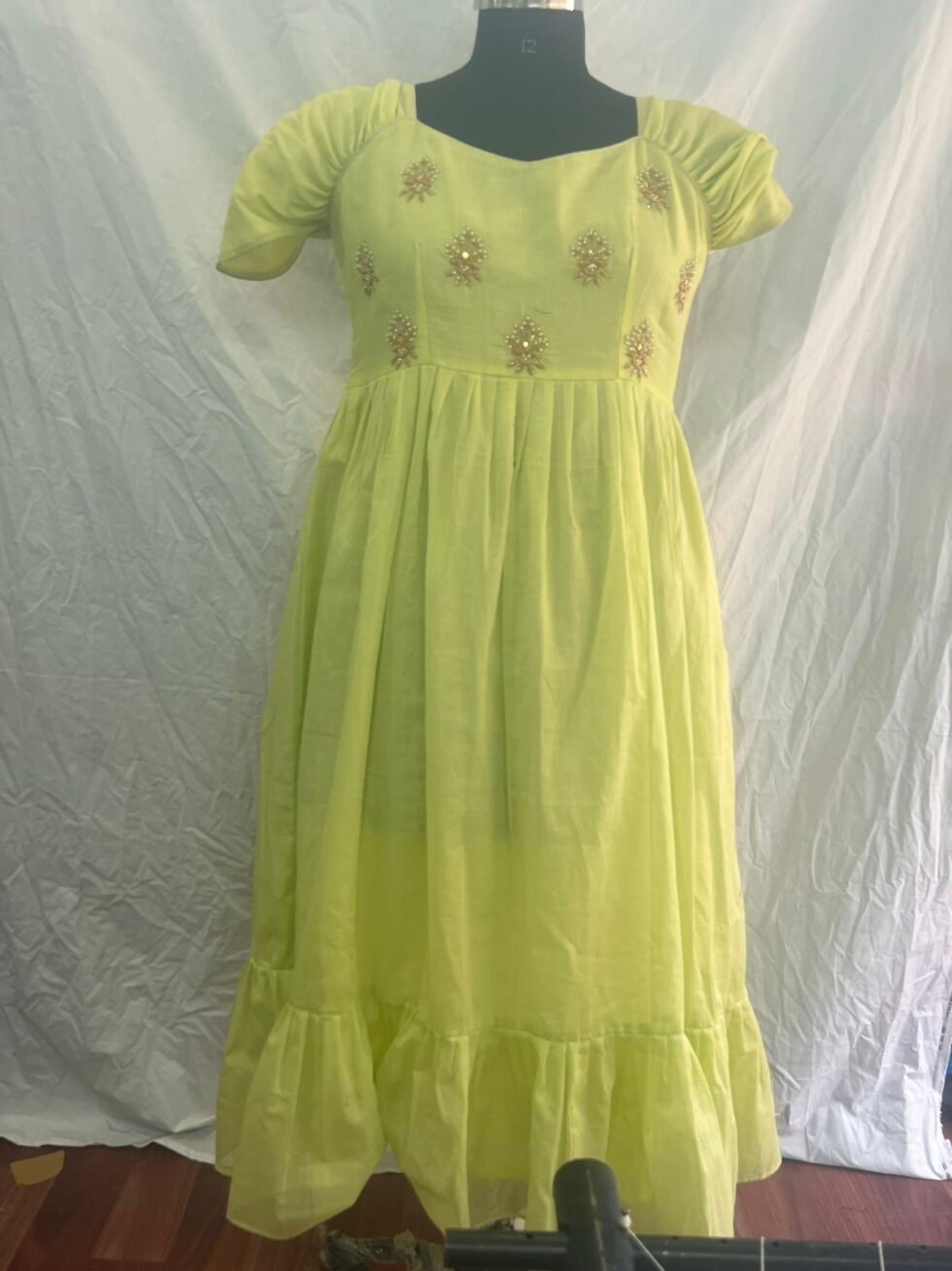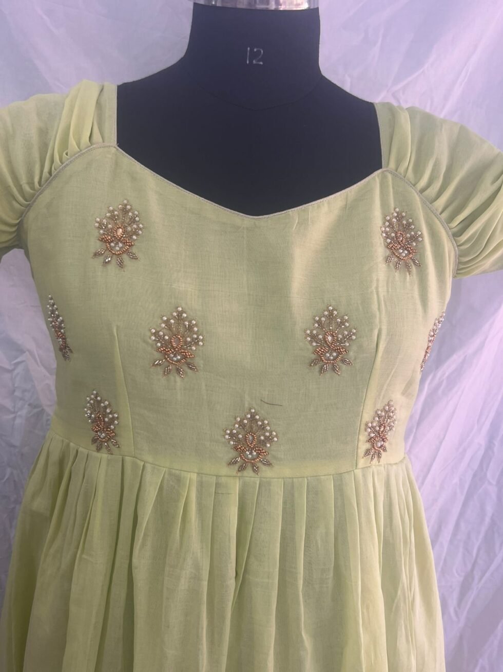 – Premium Quality Designer Pista Green Color Knee Length frock with Maggam work in Bodice area